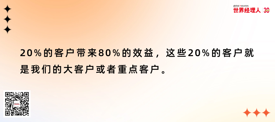 20/80原则对于销售也是成立的,也就是说20%的客户带来80%的效益,这些20%的客户就是我们的大客户或者重点客户。需要将更多的精力投入到这20%客户身上。