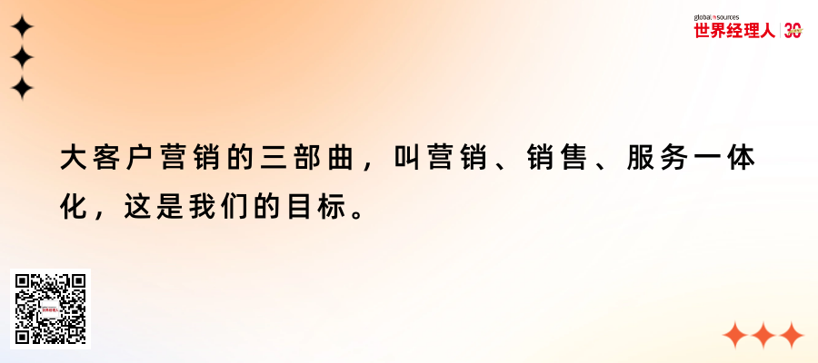 一般公司有三大部门,市场部、销售部、客户服务部。大客户营销的三部曲,叫营销、销售、服务一体化,这是我们的目标。