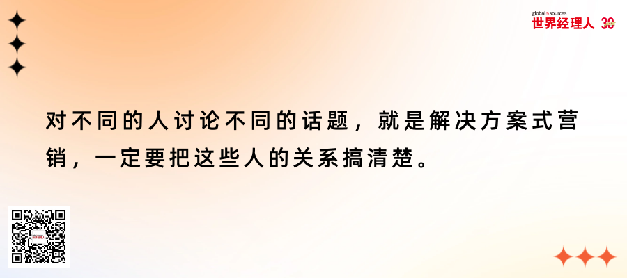 所以,对不同的人讨论不同的话题,就是解决方案式营销,一定要把这些人的关系搞清楚。在我的《说服老板签大单》一书中讲了不少这方面的内容。