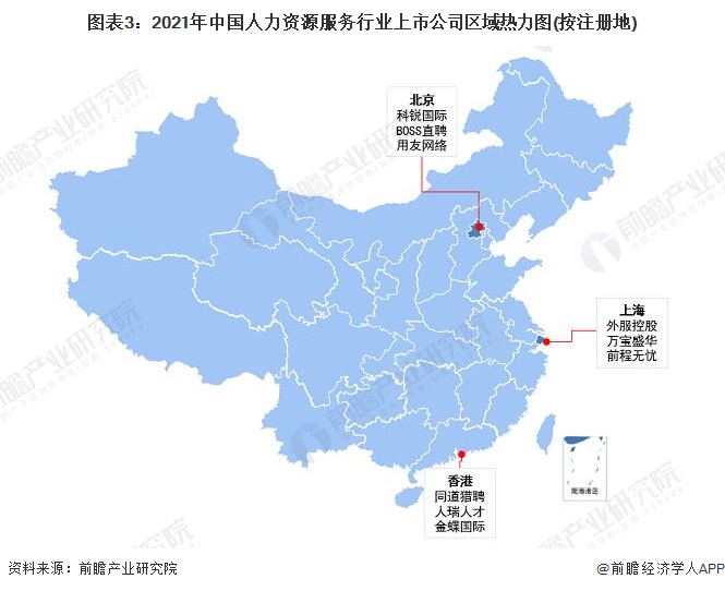 人力资源服务行业的发展与地理位置和区域经济水平息息相关。从区域分布来看,我国人力资源服务上市企业主要分布在北京、上海和香港,均为经济发达、人才集聚明显的地区,是人力资源服务行业发展的摇篮。