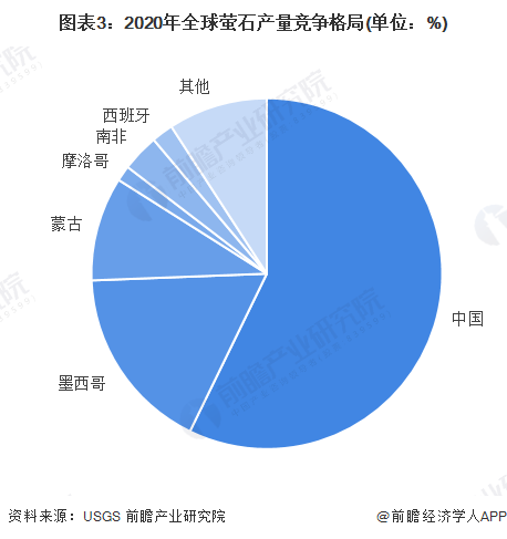 从萤石产量来看,2020年全球萤石产量约700余万吨。中国、墨西哥、南非、越南及蒙古等发展中国家是世界萤石资源的主要供应国,五国合计供应量占市场份额的90.8%,2020年我国萤石矿产量约400多万吨,占2020年全球萤石产量的57.22%,为世界萤石生产第一大国。