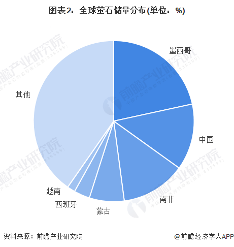 氟化工的原材料主要是萤石,世界萤石矿资源分布不平衡,各地区有很大差别。按2019年探明储量排序,墨西哥位居第一,约占世界萤石储量的21.6%;中国位居第二,约占世界萤石储量的13.3%;南非位居第三,约占世界萤石储量的13.0%;其余已知储量主要分布在内蒙古、西班牙、越南、美国、英国、伊朗、泰国、哈萨克斯坦、法国、纳米比亚等国。从成矿地质条件评价看,环太平洋成矿带的萤石储量约占全球萤石储量的二分之一以上,是全球萤石资源的主要分布区。