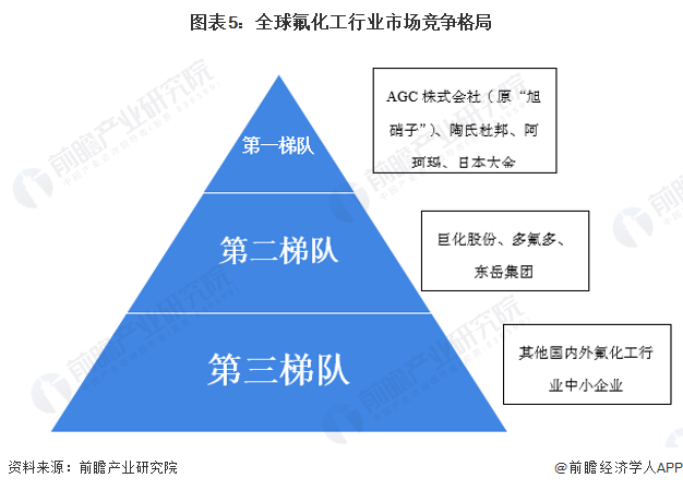 目前全球氟化工高端生产技术和产品仍主要集中于发达国家的发达企业。美国杜邦公司、日本大金等氟化工巨头基本占据了氟化工高端市场,处于行业发展第一梯队,在氟树脂品种和质量方面遥遥领先,如超细粉末聚四氟乙烯、可熔性聚四氟乙烯及常温固化型氟树脂涂料、含氟织物整理剂、新型活性涂料、液晶显示材料、光纤涂覆材料、医用含氟材料、含氟医药、新型含氟农药等。我国企业则主要集中在行业第二梯队。
