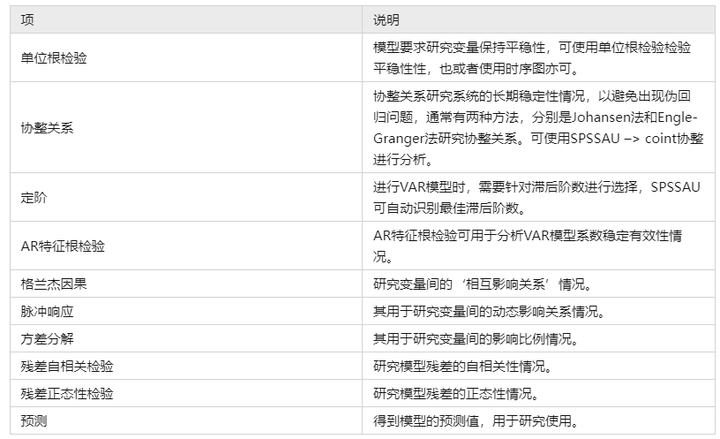 - VAR模型前通常还需要进行单位根检验(或者查看时序图)、协整检验,并且在模型后通常还需要查看格兰杰因果检验,该4项可通过SPSSAU的其它单独分析按钮进行分析使用。