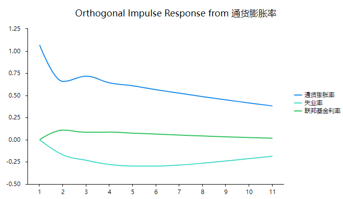从上图可以看到:针对‘通货膨胀率’冲击变量,通货膨胀率首先对自身产生正向的冲击,然后冲击力度逐渐平稳减小,但一直均有着冲击且冲击力度较大。通货膨胀率对于失业率的冲击上,其先会产生负向抑制作用,前4期时此种负向冲击作用逐渐加强,但从第5期开始,负向冲击作用逐渐减弱并且趋于平稳,一直均为负向冲击。通货膨胀率对于联邦基金利率的冲击上,一直均有着微弱的正向冲击作用,但作用力度非常有限。
