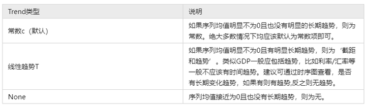 关于‘Trend类型’说明:本案例的3个数据并没有明显的趋势而且均值也不接近于0,因而选择默认的常数类型即可,绝大多数时候均应该使用常数类型。如果说研究变量的均值基本上接近于0,可以考虑使用‘None’类型,如果说研究变量有着较为明显的趋势项,此时可考虑使用‘线性趋势T’。具体更多说明可见本文档末尾的疑难解惑说明。
