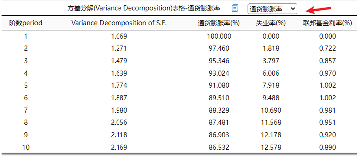 从上图可以看到,通货膨胀率对于自身的方差分解率非常高,基本上均大于85%,也即说明通货膨胀率对于自身的解释力度非常强非常相对较为平稳。对于失业率而言,通货膨胀率对其解释力度有限,基本上均低于10%,但是解释力度呈现出逐渐加大的趋势性,也即说明通货膨胀率对于失业率的影响是具有连续稳定的解释作用,并且随着时间变化,解释作用会逐步提高。最后,通货膨胀率对于联邦基金利率的方差分解来看,其分解力度非常有限,基本上均接近于0,也即说明通货膨胀率对于联邦基金利率的变化解释力度很小。