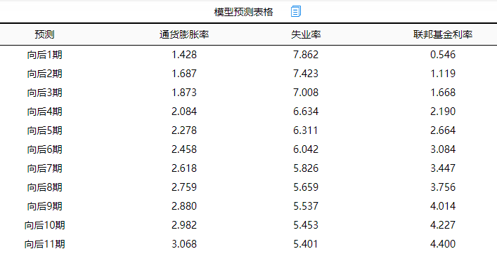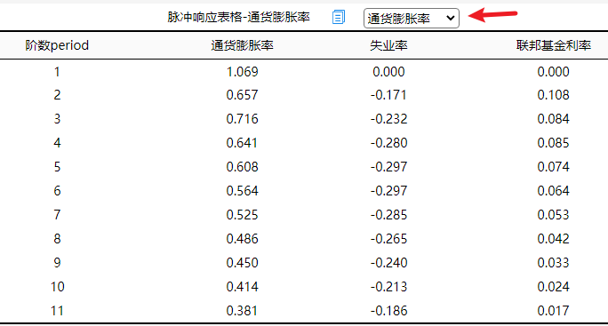 除此之外,关于失业率对于3个研究变量的脉冲响应分析表格或图,也或者联邦基金利率对于3个研究 变量的脉冲响应分析表格或图。可通过下拉选择进行切换展示分析。