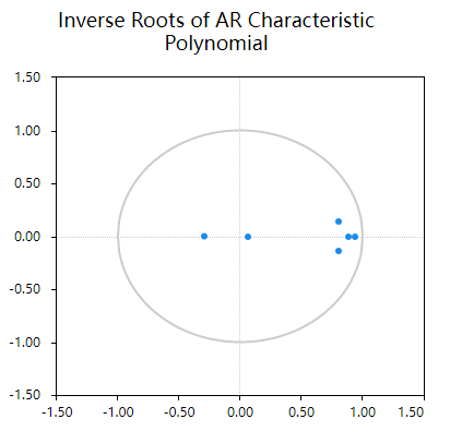 VAR模型构建后,可以通过AR根图判断VAR模型的稳定性;如果所有特征值均在单位圆内,即所有点均在圆内,此时说明模型具有稳定性;如果出现特征根在单位圆之外,意味着模型可能不具有长期持续稳定性。