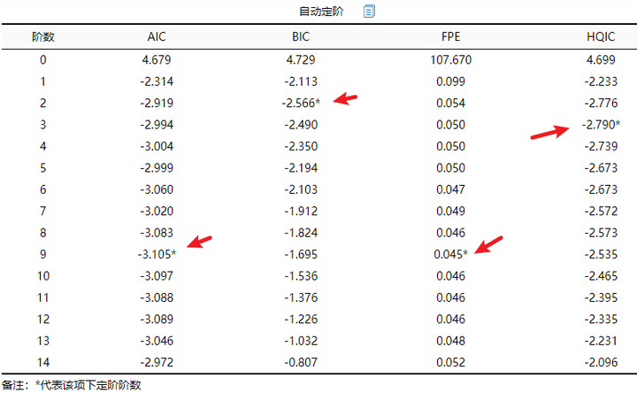 滞后阶数让系统自动定阶,当然研究者也可以自主设置阶数,具体设置原则建议结合专业知识,或者信息准则越小越好进行判断,多次构建模型对比不同滞后阶数时信息准则的大小,选择出信息准则最小对应的滞后阶数模型即可。