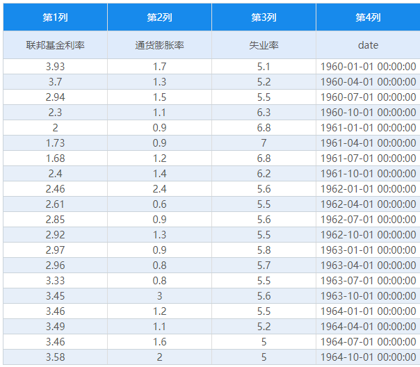 当前有一项美国宏观联邦基金利率、通货膨胀率和失业率的数据,数据日期从1960年第1季度到2012年第1季度,单位为季度,共计209个数据。现希望建立该3项数据的VAR模型,通过VAR模型查看该3项的相互依存影响关系,并且进行模型预测等。部分数据如下图所示: