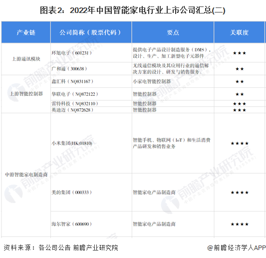 我国智能家电行业中上游芯片企业有艾为电子(688798)、赛微电子(300456);上游传感器企业有敏芯股份(688286)、必创科技(300667);上游PCB企业有鹏鼎控股(002938)、深南电路(002916)、东山精密(002384)、胜宏科技(300476);上游电容器公司有国力股份(688103)、宏达电子(300726);上游通讯模块公司有环旭电子(601231)、广和通(300638);上游智能控制器企业有鑫汇科(NQ831167)、华联电子(NQ872122)、雷特科技(NQ832110);中游智能家电制造企业有小米集团(HK:01810)、美的集团(000333)、海尔智家(600690)、格力电器(000651)、长虹美菱(000521)、科沃斯(603486);下游线下零售商有百联股份(600827)、美凯龙(601828);下游线上零售商有国美零售(HK:00493)、苏宁易购(002024)。