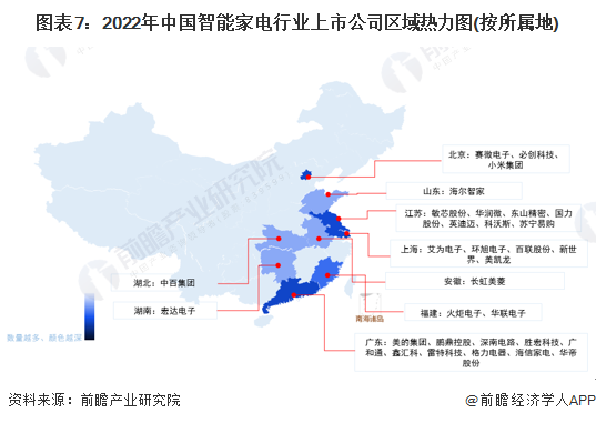 根据我国智能家电行业上市公司区域热力图来看,我国智能家电上游行业内企业多分布在上海、北京等地,智能家电上游技术与物联网衔接较为紧密,该地科研技术较强,科创型公司较多;智能家电制造企业多分布于广东省,该地制造业发展较早,拥有一定的科研以及制造优势。