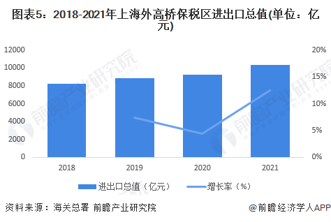2018-2021年,上海外高桥保税区的进出口总值呈逐年上升的趋势。2021年,上海外高桥保税区进出口总值突破一万亿元,达到了10356.78亿元,较2020年增长12.54%。