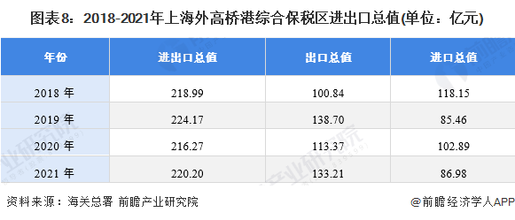 2018-2021年,上海外高桥港综合保税区的进出口总值呈波动变化趋势。2021年,上海外高桥港综合保税区进出口总值为220.2亿元,较2020年增长1.82%。