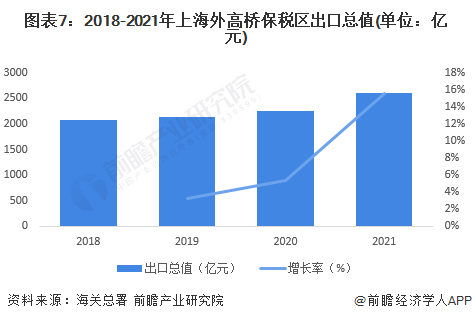 2018-2021年,上海外高桥保税区的出口总值呈逐年上升的趋势,且增长幅度逐年加快。2021年,上海外高桥保税区出口总值为2604.54亿元,较2020年增长15.54%,出口总值的增长幅度大于进口总值的增长幅度。