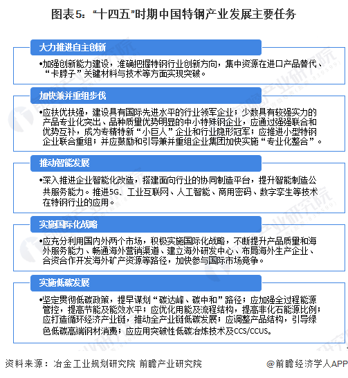 根据“中国特钢企业协会十届一次会员大会”资料,面向“十四五”发展,我国特钢行业将坚持新发展理念,坚决落实制造强国战略,支撑“双循环”新发展格局,以科技创新为动力,以供给侧结构性改革为主线,以全面提升产业竞争力为目标,攻克一大批“卡脖子”材料,加快服务升级,提升产品质量,深入实施绿色低碳发展战略,推动兼并重组,不断规范行业发展秩序,加快实现特钢大国向特钢强国转变,全面促进我国制造业强国发展,力争跨入全球特钢行业第一方阵。