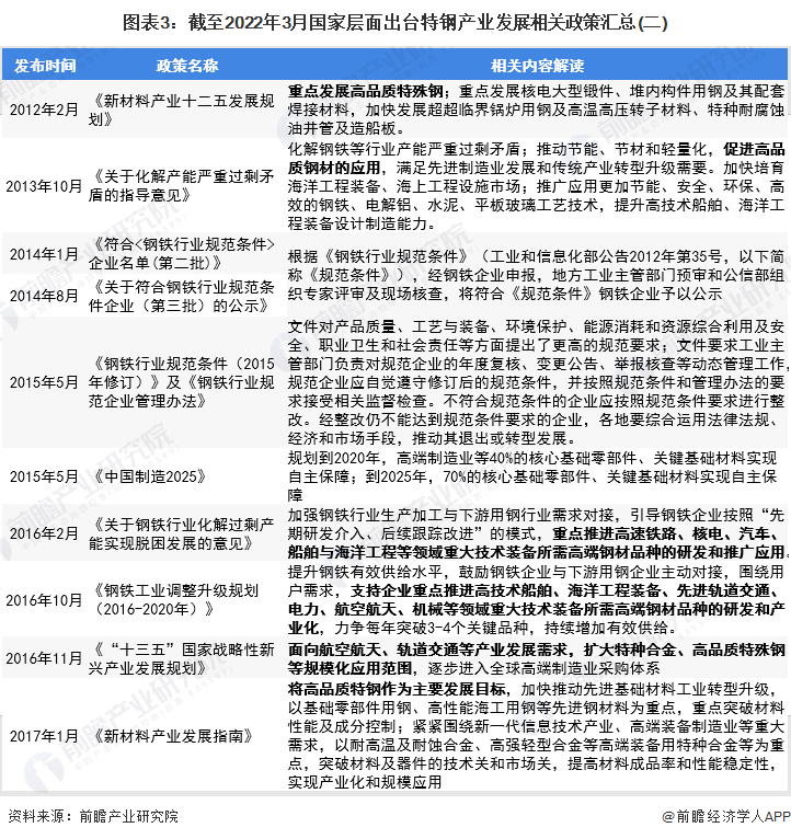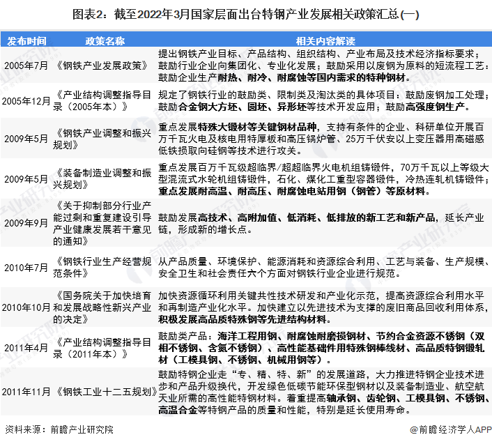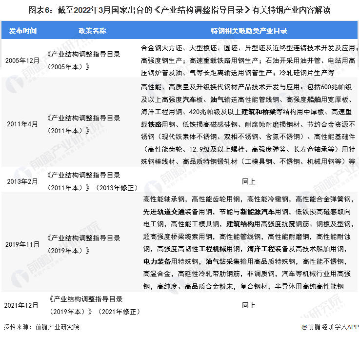 特钢产业是钢铁行业的细分高新技术领域,也是国民经济发展的支柱性产业,国家层面高度关注特钢产业发展,历年的《产业结构调整指导目录》均对特钢相关产业做出具体的引导部署。