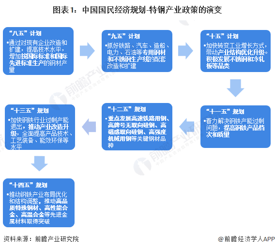特钢产业是基于传统钢铁产业升级发展的需求而快速兴起的朝阳产业,也是实现制造强国和供给侧改革的关键基础工业原材料产业。根据我国国民经济“八五”计划至“十四五”规划,国家对特钢产业的发展引导政策经历了从积极发展不锈钢等品类到重点发展高速铁路用钢等关键钢材品种,再到创新突破高品质特殊钢材、高性能合金、高温合金等先进金属材料的历程,政策层面对特钢产业发展技术水平的要求逐渐提升。