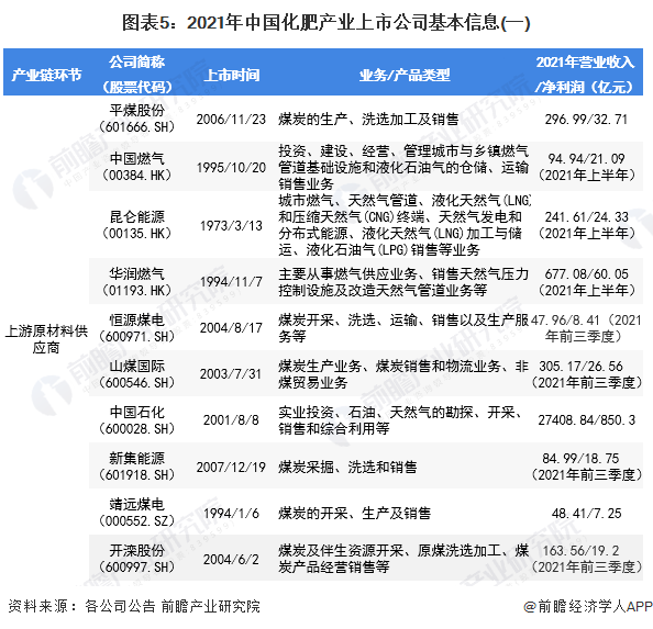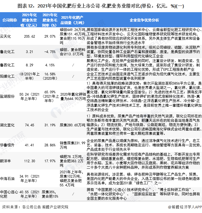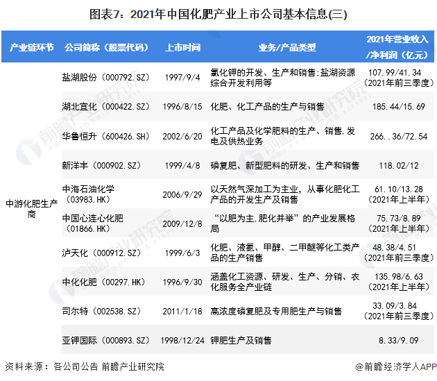 其中,涉及化肥生产制造业务的上市公司主要有云天化、鲁北化工、鲁西化工、阳煤化工、盐湖股份、湖北宜化、华鲁恒升、新洋丰、中海石油、中国心连心、泸天化、中化化肥、司尔特、亚钾国际、藏格矿业、东方铁塔、六国化工、四川美丰、兴发集团、川发龙蟒、云图控股等企业。
