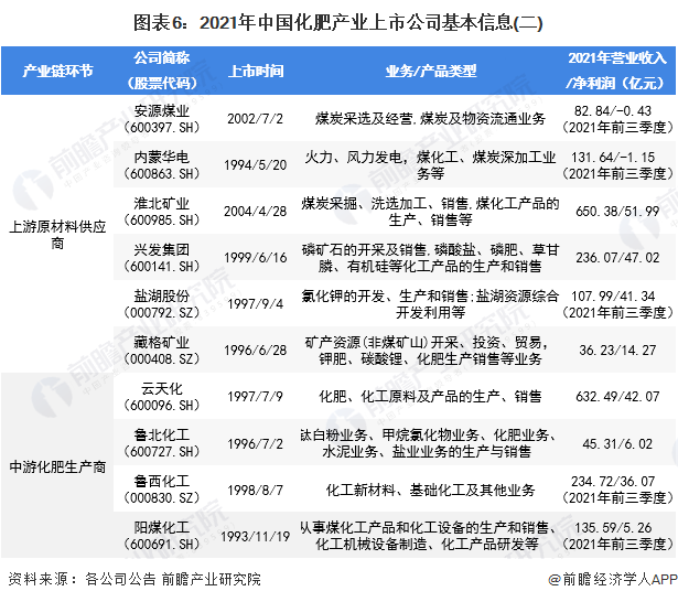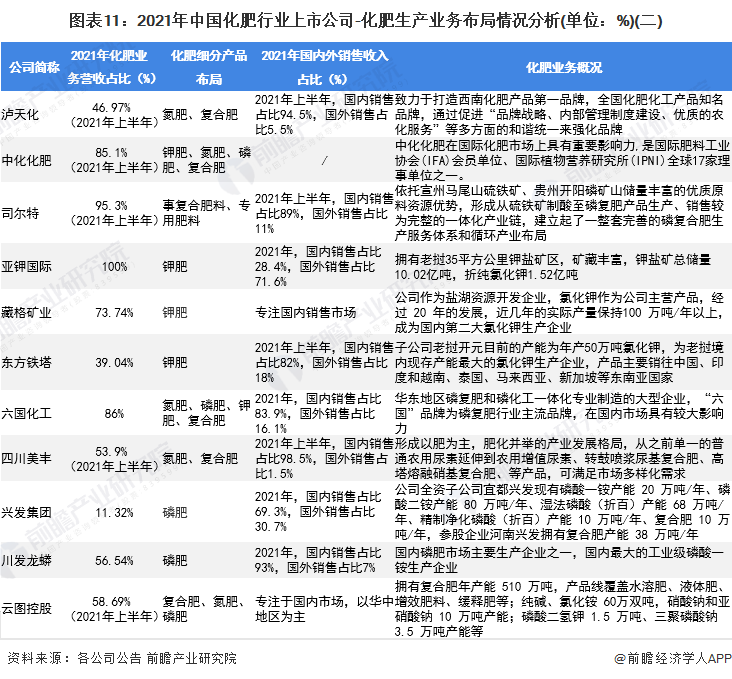 从产业链的角度来看,化肥产业链上游主要是煤炭、天然气、磷矿、硫磺和钾矿等原材料供应商,中游是磷肥、氮肥、钾肥、复合肥生产制造商,下游是化肥批发商、零售商等,最终流通到农户手中。目前,我国涉及化肥产业相关业务的上市公司主要有云天化、鲁北化工、鲁西化工、阳煤化工、盐湖股份、湖北宜化、华鲁恒升、新洋丰、中海石油、中国心连心、泸天化、中化化肥、司尔特、亚钾国际、藏格矿业、东方铁塔、六国化工、四川美丰、兴发集团、川发龙蟒、云图控股等企业。本文在对化肥产业链上市公司汇总的基础上,将从中游化肥生产制造行业中的上市公司业务布局、业绩对比及业务规划进行全方位对比。