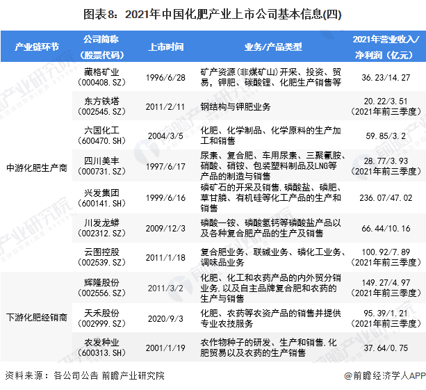 化肥是化学肥料的简称,具体是指通过化学或物理方法制成的含有一种或几种营养元素的肥料,是农业生产中最基础和最重要的物质投入。化肥行业是关系农业生产发展和农民切身利益的基础性行业。本文汇总了化肥产业链各环节主要上市公司,包括化肥产业上游的主要原材料供应商、化肥生产商,以及下游化肥经销企业。