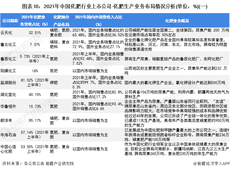 在行业相关上市公司中,新洋丰、盐湖股份、中化化肥、司尔特、亚钾国际、六国化工的化肥业务占比均超过80%,而其他企业的化肥业务占比相对较小,以多元化产业布局为主;在细分产品布局方面,行业上市企业根据自身产业基础,在细分产品类型布局方面各有侧重,如盐湖股份重点布局钾肥市场,湖北宜化重点布局氮肥市场等;在区域布局方面,大部分企业主要是深耕国内市场外,少数企业如亚钾国际等已成功开拓海外市场布局。