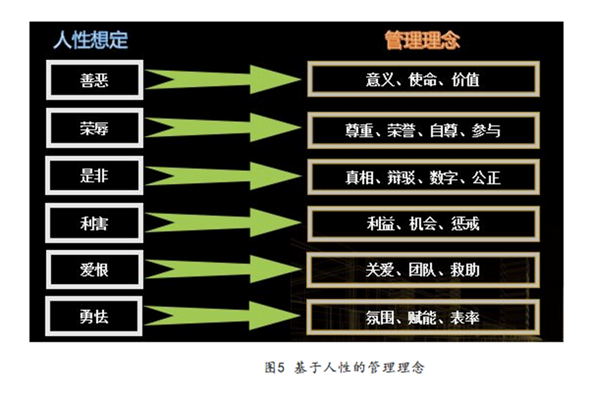 以上7条经验是操作层面的总结。进一步思考、提炼,我们发现:真正要激发一个团队,打造一支铁军,核心是基于人性的管理。由此形成三个层次:第一个层次,是企业文化的鼻祖沙因讲的“人性假设”。这个词不好理解,我换了一个词叫“人性想定”,就是对人性的理解,对人性的设想。第二个层次,是与人性对应的管理理念和原则。第三个层次,是由理念、原则所生出来的管理政策、机制、方法等。所谓“道生一,一生二,二生三,三生万物”。