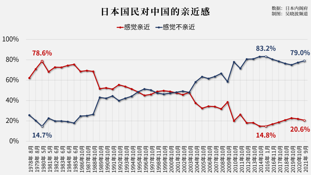 日本内阁府每年都会进行外交舆论调查,自1978年两国建交以来,日本民众对华亲近感曾在1980年达到顶峰,而后一路跌落。