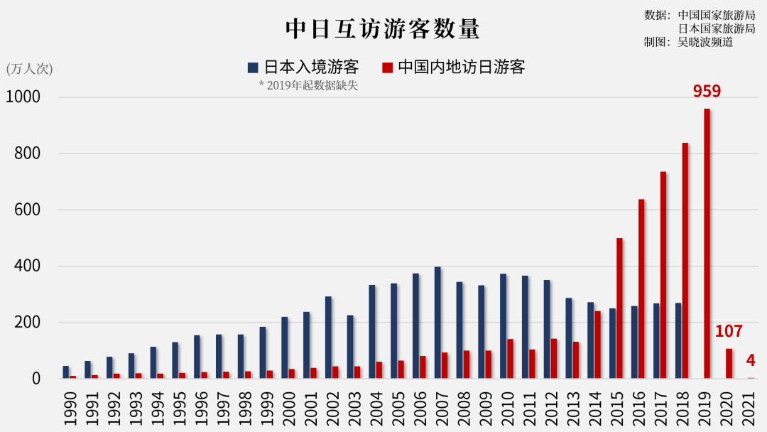 中国国家统计局没有公布2019年—2021年日本入境游客的数据,但不难猜想。
