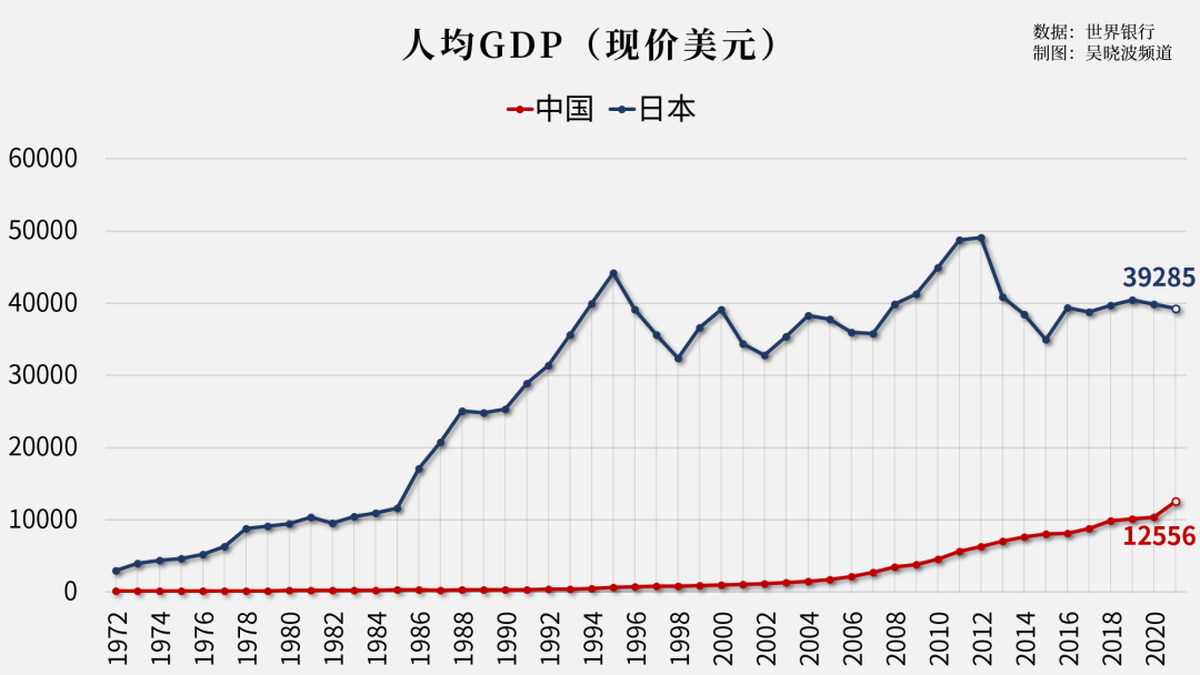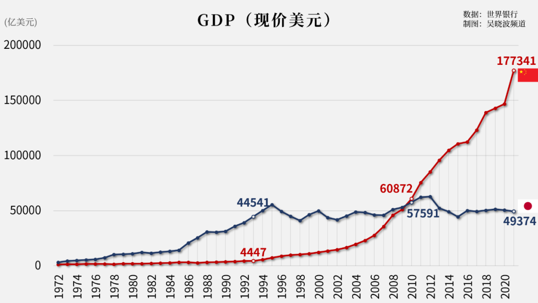而自1993年以来,中国的名义GDP翻了近40倍,于2010年超越日本,到2021年已是日本的三倍有余。