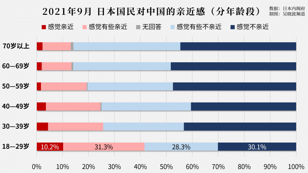 值得一提的是,虽然日本民众对华情绪惨不忍睹。但分年龄段来看,越是年轻一代,对华越是友善。