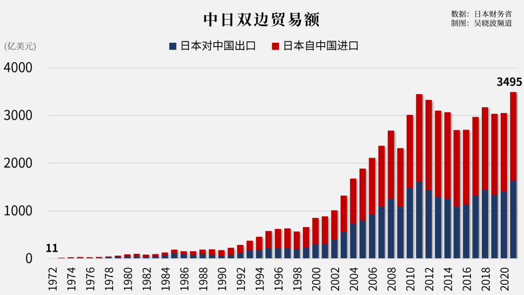 1972年邦交正常化之时,中日双边贸易额只有11亿美元,而到2021年,创下历史新高,达到3495亿美元(数据来自日本财务省,中国海关数据为3714亿美元)。