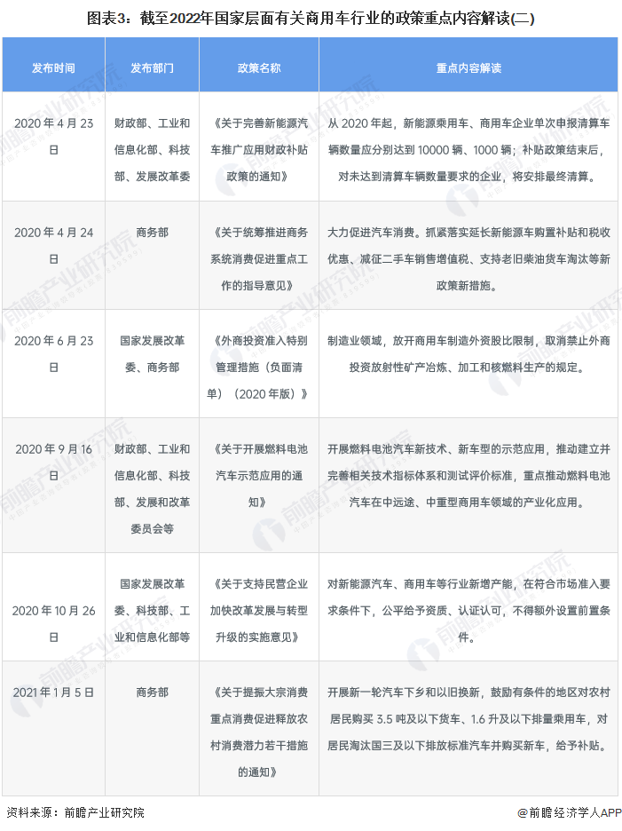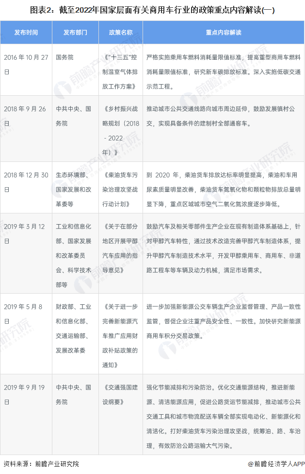 自2016年以来,国务院、国家发改委、工业和信息化部等多部门都陆续印发了支持、规范商用车行业的发展政策,内容涉及农村客运网络、新能源商用车补贴、新能源商用车充换电设施建设等内容: