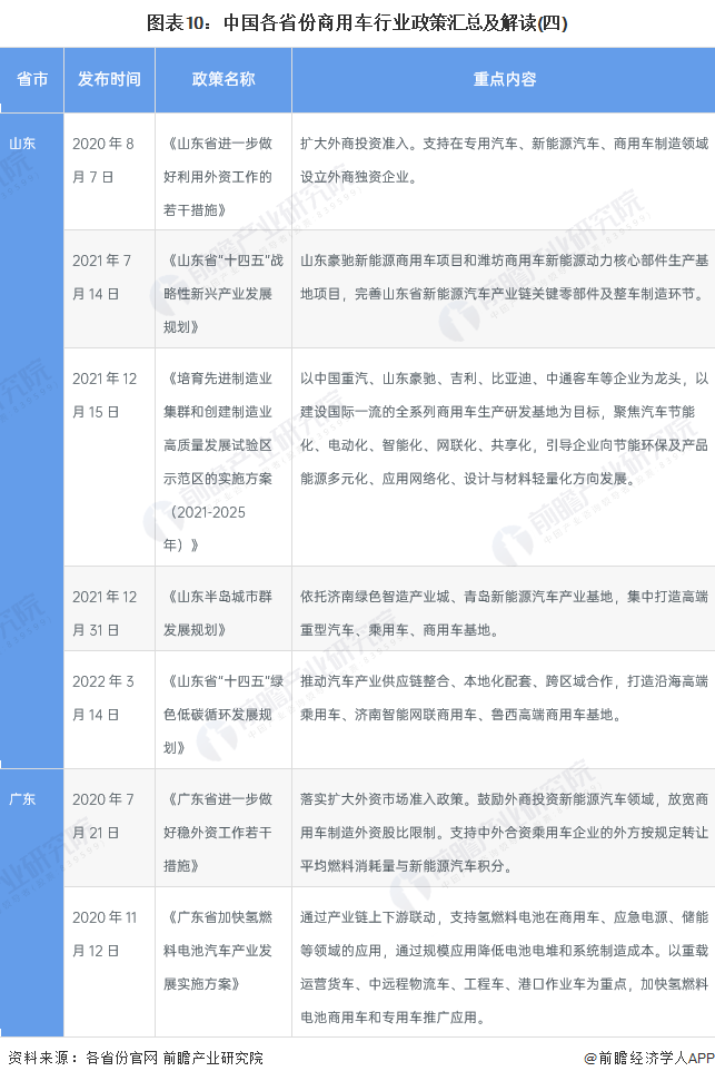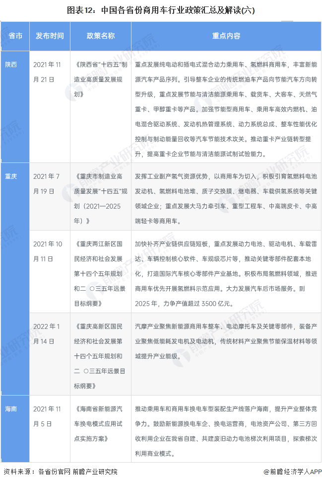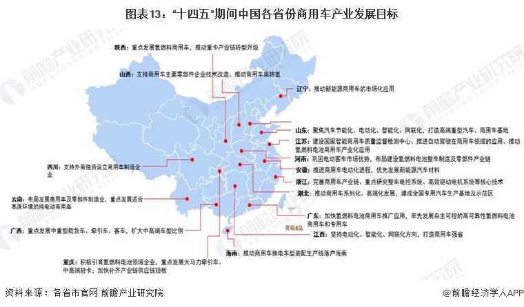 “十四五”期间,我国主要省份也提出了商用车行业的发展目标。其中,陕西、河南、江苏、广东等省份明确提出重点发展氢燃料电池商用车,而浙江、重庆、云南等省市则将发展重点放在完善新能源电动车产业链上,而海南由于其独特的地理位置及产业结构,将换电型商用车产业作为未来发展商用车的重点。总体来看,“十四五”期间我国商用车行业发展的主旋律是推动新能源商用车发展,但各省由于产业基础、发展条件的不同,发展重点有所区别。