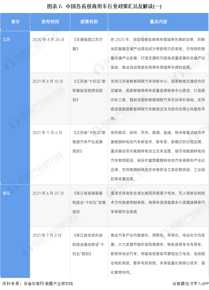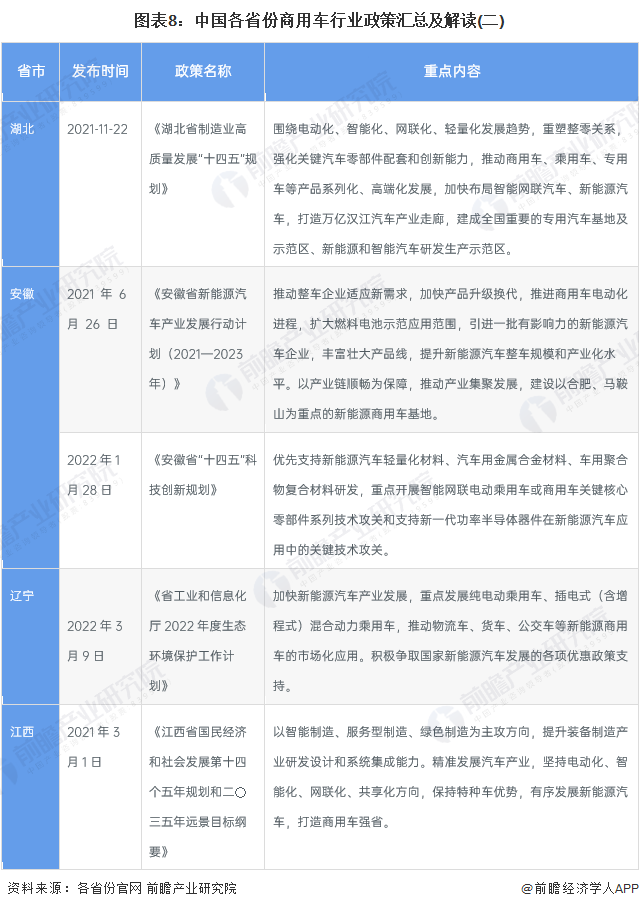 2019年,国务院发布《交通强国建设纲要》,强调要推进公共交通工具和城市物流车新能源化、电动化,打好柴油污染攻坚战。2020年以来,江苏、浙江、湖北、安徽等省份先后发布了商用车产业发展相关政策,我国商用车行业发展正式进入了新能源阶段: