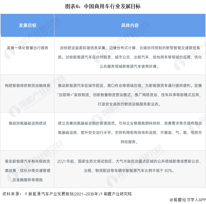 2020年10月,国务院办公厅发布了《新能源汽车产业发展规划(2021—2035年)》,为我国新能源汽车未来15年的发展设定了一系列目标。在商用车领域,规划指出要加快新能源汽车在城市公交领域的应用,推动新能源汽车在城市配送、港口作业等领域的应用,为新能源货车出行提供便利;自2021年起,国家生态文明试验区、大气污染防治重点区域的公共领域新增或更新公交、出租、物流配送等车辆中新能源汽车比例不低于80%。另外,规划还提出要积极推进氢能源基础设施的建设,为未来氢能源商用车的发展提供良好的环境。
