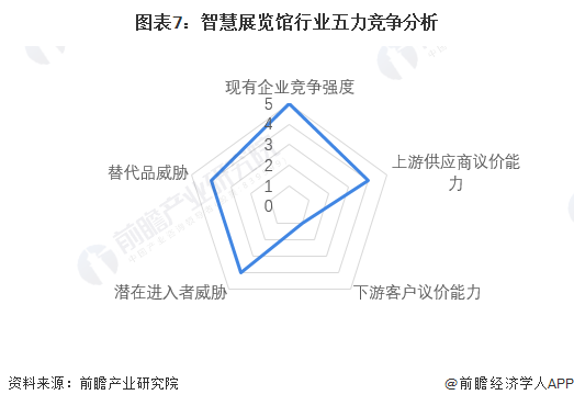 根据以上分析,对各方面的竞争情况进行量化,5代表最大(竞争激烈/威胁大/议价能力强),0代表最小(竞争小/威胁小/议价能力弱),智慧展览馆产业的竞争情况如下图所示。