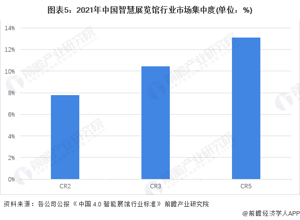 总体来看,我国智慧展览馆行业的市场集中度较高。经初步测算,2021年行业CR2占据智慧展览馆行业市场份额8%左右,行业CR5市占率13%,主要是因为智慧展览馆行业准入门槛不高,其技术壁垒与资金壁垒较低。