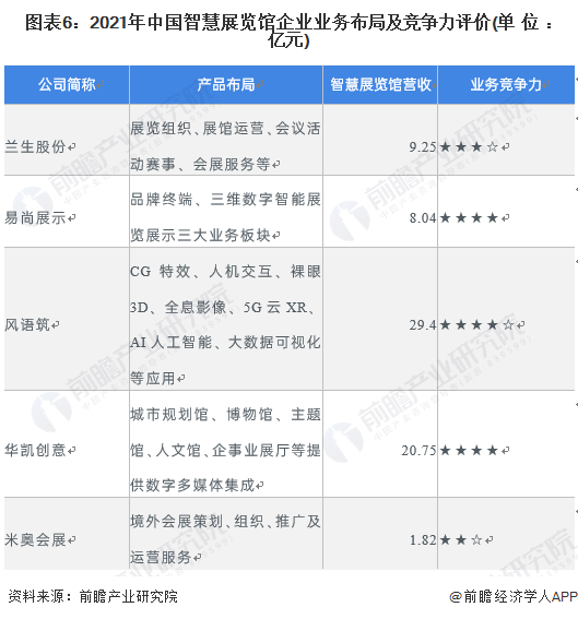 目前,布局了智慧展览馆生产业务的上市企业中,易尚展示、风语筑、华凯创意的智慧展览馆产品具有较高的竞争力。智慧展览馆产业链上的代表性企业业务布局及竞争力情况如下: