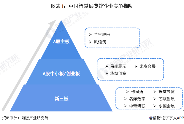 我国智慧展览馆生产行业依据企业的上市情况划分,可分为3个竞争梯队。其中,登陆A股主板企业有:东浩兰生会展集团股份有限公司、上海风语筑展示股份有限公司;登陆A股创业板或中小板的企业有:深圳市易尚展示股份有限公司、湖南华凯文化创意股份有限公司、浙江米奥兰特商务会展股份有限公司;另外行业内还存在若干新三板上市企业。
