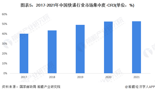 2017-2021年,中国快递行业市场集中度-CR3呈逐年上升的趋势,通达系内部竞争持续进行,综合实力具有优势的头部快递企业规模不断扩大,行业CR3持续提升,2021年行业CR3达到了52.9%。