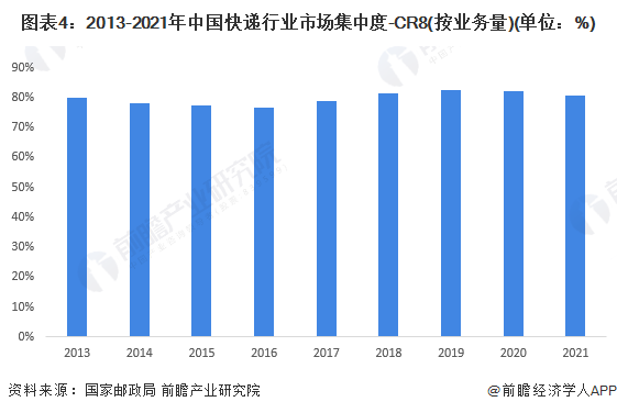 2013-2021年,中国快递行业市场集中度-CR8整体比较稳定,始终维持所在75%-85%之间。2021年,中国快递行业市场集中度-CR8为80.5%,较2020年下降了1.7个百分点。