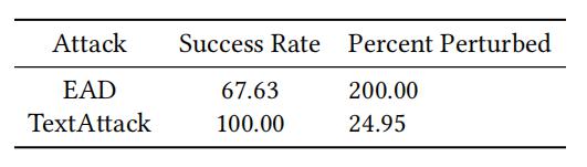 为了评估 EAD 和 TextAttack 实验的结果,研究人员使用了两个指标:平均扰动和攻击成功率。如下图所示,在进行攻击之前获取了模型的基线。