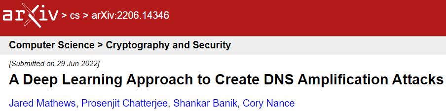 该研究以「A Deep Learning Approach to Create DNS Amplification Attacks」为题,于 2022 年 6 月 29 日发布在 arXiv 预印平台。