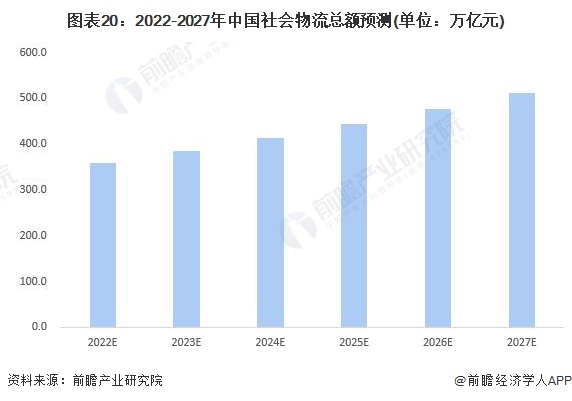 “十四五”时期,我国将聚焦补齐现代流通体系短板,着眼现代流通体系高质量发展,加快形成现代流通统一大市场,发展现代商贸流通和现代物流两大体系等方面进一步快速健全我国物流体系。前瞻根据近年来我国社会物流总额及社会物流总收入变化趋势,对2022-2027年中国社会物流总额及社会物流总收入进行预测,初步得到至2022年末,我国社会物流总额可达到约360万亿元,社会物流总收入可达到约12.8万亿元;至2027年末,我国社会物流总额或将突破510万亿元,社会物流总收入可达到约18.6万亿元。
