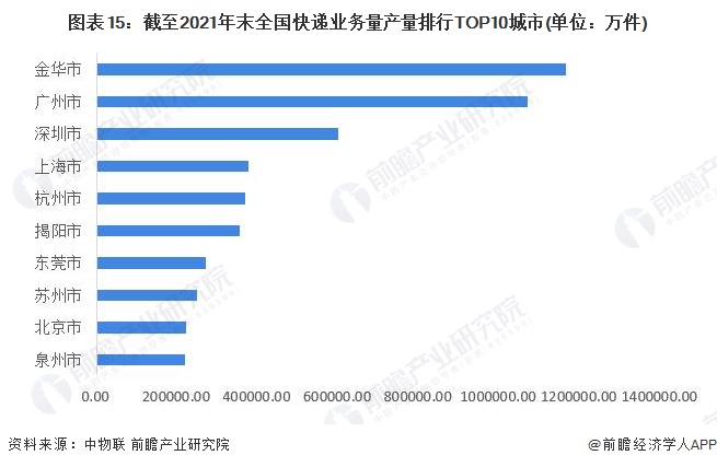 因目前中物联和国家统计局未公布各省份物流业总额和总收入情况,故按照各省份快递业务量排名来看,金华市和广州市的快递业务量远超其他城市。2021年全年,浙江省累计快递业务量1163887.9万件,为我国快递业务量最多的城市;广州市排名第二,2021年快递业务量达10677831.2万件。进入全国快递业务量产量排行TOP10的城市还有深圳市、上海市、杭州市、揭阳市、东莞市、苏州市、北京市和泉州市