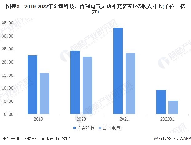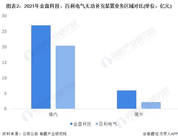 从无功补充装置业务区域来看,金盘科技、百利电气无功补充装置业务均集中于境内,2021年金盘科技境内营业收入26.9亿元,境外营业收入5.94亿元;百利电气境内营业收入20.35亿元,境外营业收入2.14亿元。在境内与境外市场,金盘科技营业收入均高于百利电气。