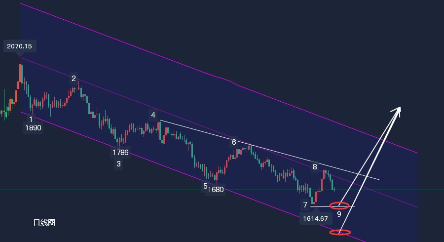 盘面分析,日线级别九浪结构,目前价格重返通道内,有望二次探底1614,下方关注1614和通道趋势线支撑,九浪见底黄金将开启中期多头走势。
