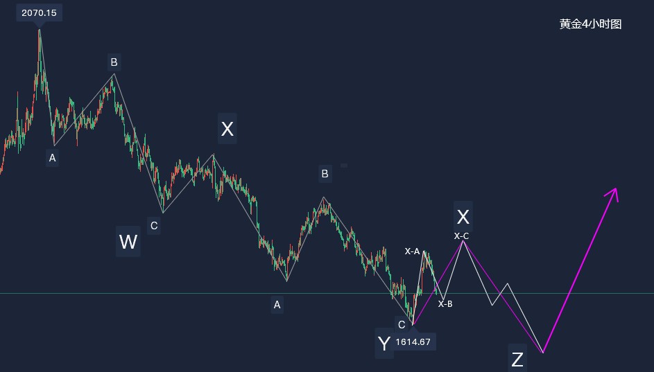 3、这两种走法的区别在于,双重三浪已见底,后面会不断向上创新高,回踩不破新低,操作上可以逢低做多长线持有多单。而三重三浪结构目前运行的是X浪的内部ABC,X浪完成还有一波下跌触及1614或破底1614,因此两种结构目前起点都是低多,操作上后面要注意。一个是向上,一个是向下。